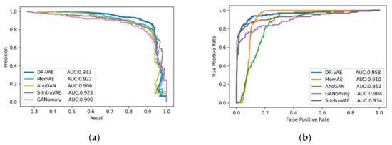 To evaluate the ability of DR-VAE to detect the rail surface defects, we conducted comparison experiments using PR curves and ROC curves (receiver operating characteristic curves). ROC curves do not vary with the classification distribution and are a widely used evaluation for classifiers with unbalanced binary prediction problems because they are not biased towards majority or minority classes. Contrast algorithms included GANomaly [21], AnoGAN [23], MemAE [25], and Soft-IntroVAE [27]. Figure 10 show the ROC and PR curves on the rail surface dataset to see that the proposed DR-VAE has an AUC = 0.933 for the PR curve and an AUC = 0.958 for the ROC curve, which has a significant advantage over other leading methods. The reason is that our proposed model greatly improves the ability on the removal of defects while retaining enough critical information of normal images through self-supervised learning. Meanwhile, the sharpness of the reconstructed rail surface images is also improved through introspective adversarial training.