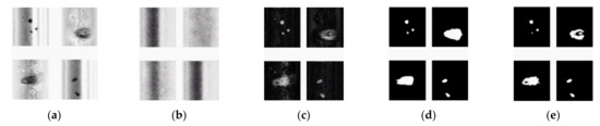 Representative defect segmentation results: (a) Rail surface image; (b) Reconstruction of images; (c) Residual images; (d) True value; (e) Our results.