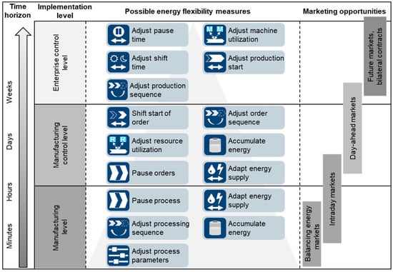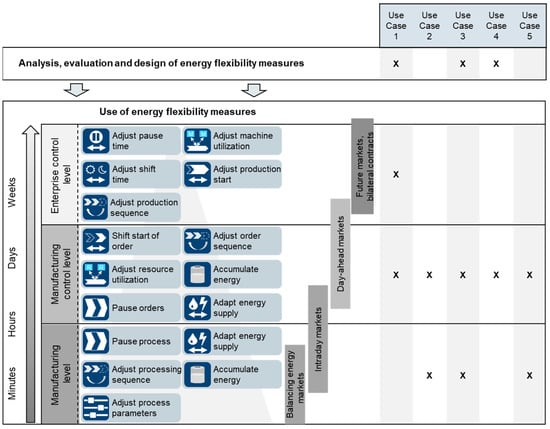 Energy flexibility in the context of manufacturing is defined as the “ability of a production system to adapt quickly and in a process-efficient way to changes in the energy market [respectively, in energy availability]” [10] with the overall objective of minimizing the energy costs [10]. The energy flexibility potential of a production system is determined by the characteristics of the available adaptive measures—the so-called energy flexibility measures [11,12]. An energy flexibility measure is a “deliberate action to implement a defined change of state in a production system” [10]. The change of state at the production system level is the result of a change of state of one or multiple end energy consumers within the system (e.g., production stations or supply utilities). Energyflexibility measures can quantitatively be described by a set of parameters encompassing the dimensions power, time, and costs [12,13]. Figure 1 depicts available energy flexibility measures in the energy-flexible factory, their respective level of implementation as well as marketing opportunities.