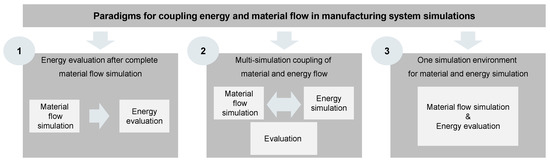 By definition, energy flows are continuous, whereas most manufacturing systems are modeled as discrete-event simulations. The challenge is therefore—in contrast to the simulation of continuous processes in the process industry—to combine both paradigms. According to Herrmann et al. [25], three paradigms can be distinguished for coupling energy and material flow in manufacturing systems: conducting energy evaluation after material flow simulation is completed (unidirectional), multi-simulation coupling of different specific simulation environments (bidirectional), and simulation of material and energy in one simulation entity (integrated). The paradigms are also shown in Figure 2. However, not every approach can be clearly assigned to one of the defined paradigms, and different use cases within one paradigm can differ greatly in terms of their implementation.