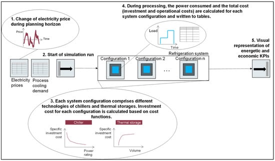 The storage alternatives represent the scope of the solution for the design of the cooling supply system. The model for each alternative is simulated considering the forecasted electricity prices, cooling demand, and weather conditions. To optimize the operation strategy of the refrigeration unit (more precisely, the compressor), the simulation model is coupled with an algorithm that was specifically developed for this application and implemented in the Python programming language. The algorithm developed ensures that the storage is charged and discharged in such a way that the electricity costs are lowest and the cooling demand is always covered. Finally, the energy demand and the energy costs are determined for each alternative. In combination with the investments incurred, a comparison can be made regarding the total costs. This enables the user to select the optimum system configuration for the application.