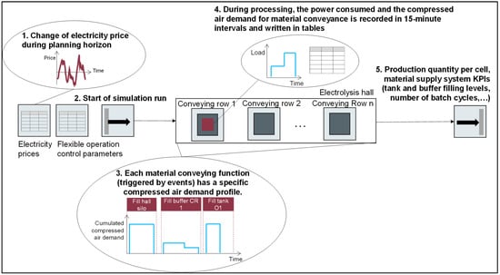 To identify bottlenecks in material flows, the production system was modeled in Tecnomatix Plant Simulation 14. First, the production system was analyzed to identify the relevant system components. These components were then modeled by adapting basic class objects provided by the software and integrated in an object-oriented modeling library. Using a bottom-up approach, higher-level system units were created by combining the adapted basic objects. The next higher-level system unit is an electrolysis cell, which includes elements such as a reservoir for liquid aluminum, dosing devices for alumina and aluminum fluoride, crust breakers, and alumina containers. Several serial electrolysis cells form a complete conveying row. Figure 7 shows a schematic representation of the coupling of material and energy flow in the respective use case. A complete production hall comprises a network of several parallel conveying rows, the supply pipeline network, alumina silos as well as additional conveying units (e.g., pressure conveying vessels, airlifts and fluidization channels). Halls and other conveying units were modeled as single stations from the category material flow. Silos, containers and dosing devices were modeled using objects from the category liquids. Coupling of the material flow with the electrical energy demand is realized through the software-internal energy function. The coupling of the material flow with the compressed air demand for material supply is realized through methods that are triggered in certain constellations of material flow and, for example, write the compressed air demand for certain conveying tasks in tables.