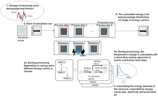 The simulation model shows the material flow with all relevant technical, organizational, and process-related restrictions. The mapping of the energy flow was integrated directly into the material flow simulation. Figure 4 shows a schematic representation of the coupling of the material and energy flows in the respective use case. Energy data in the form of product-specific heating curves are stored in the resource components representing the furnaces, read, and documented in discrete time steps of 15 min linked to the machine state.