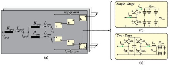 The association of a BESS with MMC is denominated as an MMC-based BESS. In this system, the battery rack can be connected directly to the MMC dc-link, called a centralized configuration, or disposed in each SM of the MMC, called a distributed configuration []. In a centralized configuration, long strings of batteries are needed to obtain high voltage []. According to Figure 1b,c, two configurations of an MMC-based BESS are investigated in this work: single-stage (SS) and two-stage (TS). In the SS approach, the batteries are connected to the SM. This connection can be direct [] or through passive filters [,]. The battery current presents low-order harmonic components. These components, especially the first-order and second-order, increase the battery RMS current. References [,] state that low-order harmonics can increase the internal temperature of batteries. Therefore, it would increase the internal losses of the battery, which could reduce battery life. An alternative to mitigate the low-order harmonic contents is the use of passive filters []. However, the use of these filters can increase the volume of SM, especially associated with inductors [].