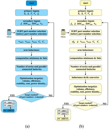 Flowcharts to optimize the designs of the MMC-based BESS: (a) SS approach configuration; (b) TS approach configuration.