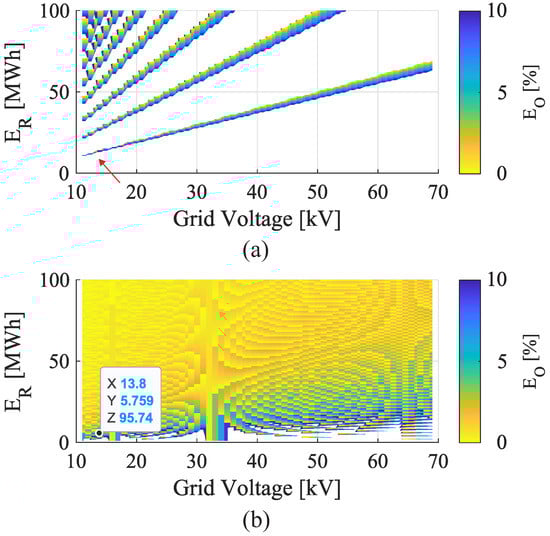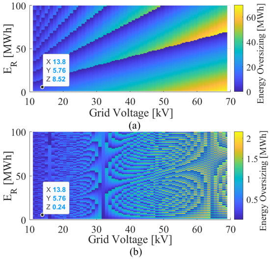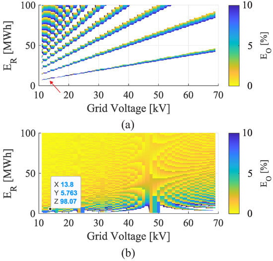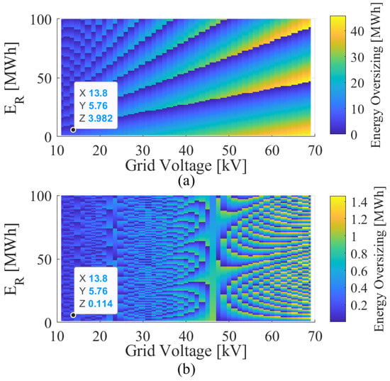 Figure 3 presents an analysis of energy oversizing for different voltage and energy required values. In Figure 3a, the values for the standard solution are shown. Note that projects with less energy oversizing are shown diagonally in the darkest color. For the selected case study, the energy oversizing approaches 50%. On the other hand, in the customized solution shown in Figure 3b, the range of energy oversizing in the standard solution is up to 30 times higher than in the customized solution. Furthermore, more areas have less energy oversizing.