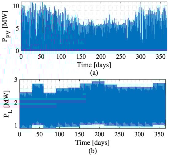 Figure 7a shows the PV power plant generation for the city of Viçosa in the state of Minas Gerais, Brazil, based on a 10 MW PV system. In addition, Figure 7b presents the active power profile over one year for a typical load at the Federal University of Viçosa.