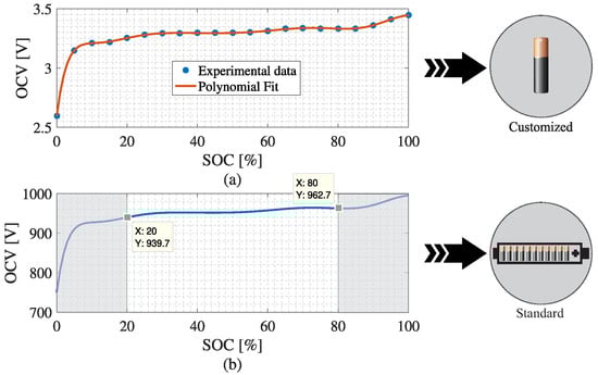 Based on experimental results for a single LiFePO battery from [], the OCV characteristic of a single battery cell as a function of the SOC is presented in Figure 8a. This curve was estimated based on a curve-fitting with an 11-order polynomial. Then, these values were extrapolated to estimate the curve for the Samsung battery rack as shown in Figure 8b.