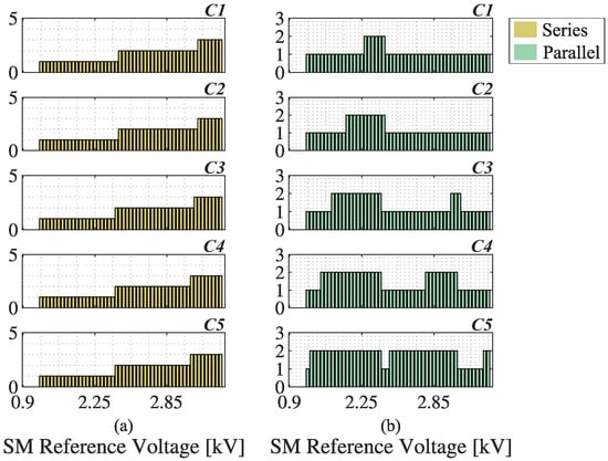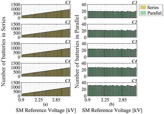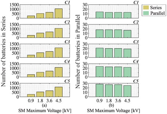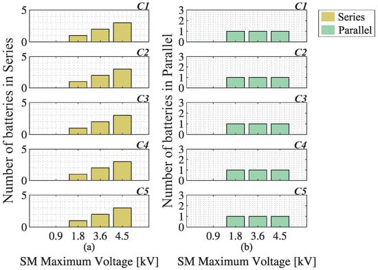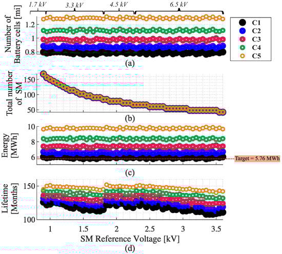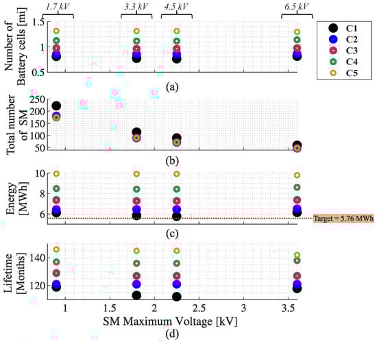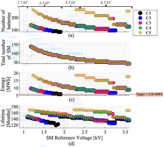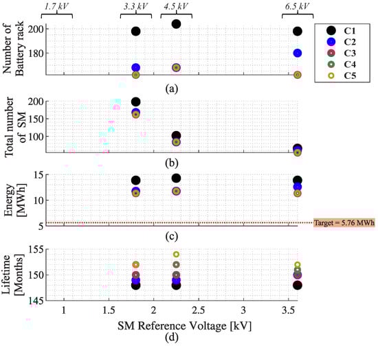 Figure 17a shows the number of battery cells for each SM reference voltage value and for each IGBT-blocking voltage. Cases with a longer SOC range need fewer battery cells to achieve the power requirement. In addition, the distance between the number of batteries between C3, C4, and C5 is justified by the rounding for that value range.