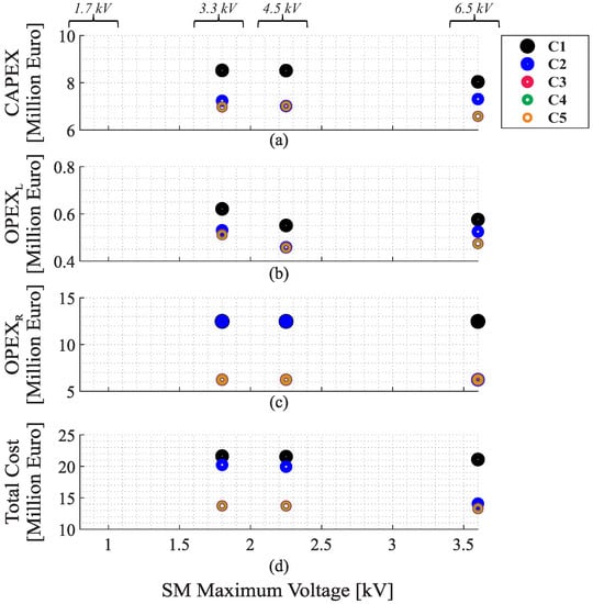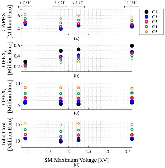 Figure 18c shows the OPEX. As seen in Figure 18d, the lifetime of the battery cells became shorter. As such, most cases required more than one replacement. Finally, the total cost is displayed in Figure 18d. For the IGBT 1.7 kV and 3.3 kV, C1 presented the lowest costs. As for the 4.5 kV and 6.5 kV IGBT, C5 was the ideal cost option.