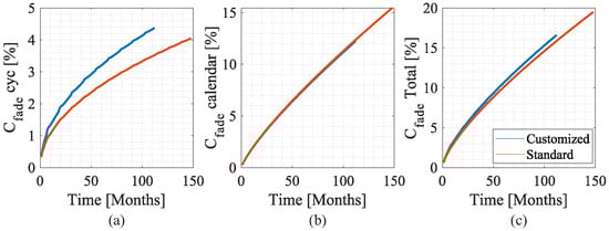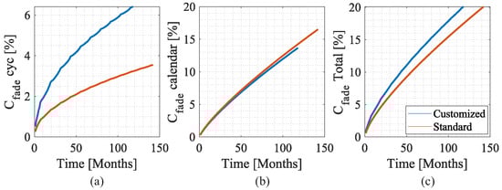 Another effect that impacts battery degradation is calendar aging. In this analysis, the intervals of inactivity of the batteries were considered. According to Figure 14b, this degradation mechanism is superior to cycling in the customized and standard solution. This is justified by the fact that the batteries assist the system only during peak hours. In addition, as the standard solution has higher energy oversizing, the inactivity intervals are longer. Finally, Figure 14c shows the lifetime of the batteries for each model. This time was counted after reaching a total capacity fade of 20%.