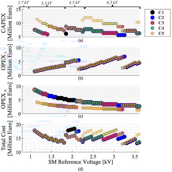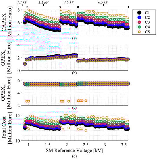 Table 7 presents the designs that have the lowest costs for each IGBT-blocking voltage. In addition, the design considered the overall best is highlighted. For the 6.5 kV IGBT, C5 shows an estimated cost of EUR 12.01 million.