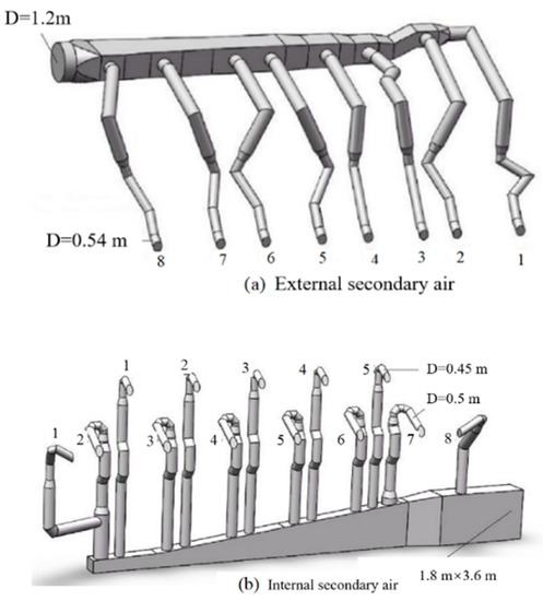 For CFB boilers, the layout and design of secondary air ducts need to consider the influence on the gas–solid two-phase flow, combustion, and heat transfer characteristics in the furnace [12,13,14,15,16]. Among them, gas–solid flow is the basis, and there was some research about the incident depth of secondary air and the effect of secondary air on the particle concentration in the furnace based on tests or calculations [17,18,19,20,21]. However, few reports were about the uniformity of the layout of secondary air bellows and branch pipes of actual supercritical CFB boilers. Only Zhou et al. [22] studied the secondary air box and branch pipe layout of a 600 MW CFB boiler through actual measurement and numerical calculation and put forward some suggestions.
