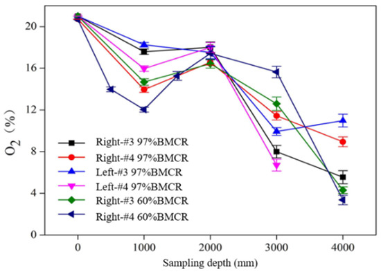 Figure 4 shows the oxygen distribution in flue gas of four secondary air nozzles on both sides of the wall along the horizontal axis of the nozzle under 97% and 60% boiler load. It can be seen that the oxygen distribution trend of the four secondary air nozzles on the horizontal axis of the furnace was basically the same under different loads. The test results basically represented the distribution of oxygen in the secondary air jet in the furnace. Meanwhile, it can be found that under different boiler loads, the oxygen concentration in the furnace presented a trend of decreasing–increasing–decreasing, which indicates that the trajectory of the secondary air jet was in the shape of first bending downward and then up warping, as shown in Figure 5. The results were also consistent with the existing literature [25].