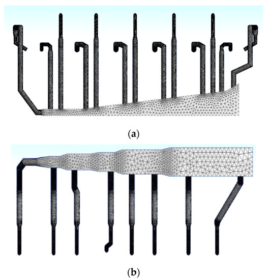 Grids of secondary air system and pipes. (a) Mesh generation of internal side upper and lower secondary air. (b) Mesh generation of secondary air calculation on the outside.