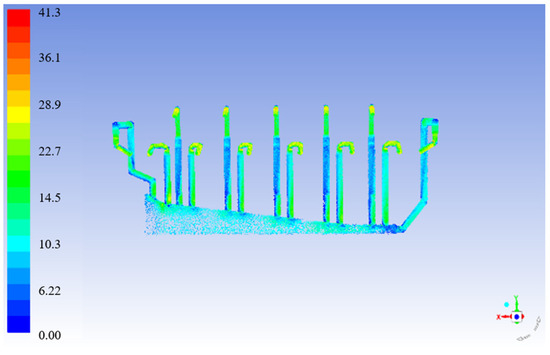 The simulation results of the lower secondary air inside the 660 MW ultra-supercritical CFB boiler are shown in Figure 12. It can be seen that the air velocity deviation of eight nozzles of the internal lower secondary air was large, and the air velocity near the front and rear walls was high, the velocities of the middle 3#, 4#, 5#, 6# nozzles were relatively uniform, and the maximum deviation rate was about 17%. However, the deviation level was still slightly better than that of the 600 MW supercritical CFB boiler under actual furnace test conditions.
