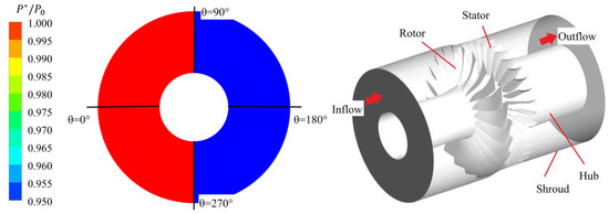 To study the coupling case of the circumferential total pressure distortion and low Reynolds numbers on the single-stage compressor performance, full-annulus calculations are applied. The computational domain is shown in Figure 1. In the setup of the computational domain, according to the Laplace equation, the inlet boundary is extended ~0.5 times the circumference of the casing upstream of the blade leading edge, and the outlet boundary is extended ~1.0 times the circumference of the casing downstream of the blade trailing edge. The uniform inlet boundary is an injection with uniform total temperature (288.15 K) and total pressure (101,325 Pa). The average static pressure is specified at the exit of the computational domain. Meanwhile, nonslip and adiabatic conditions are set on the hub, shroud, and blade parts.