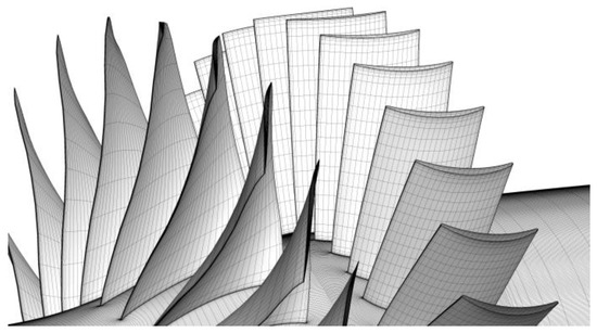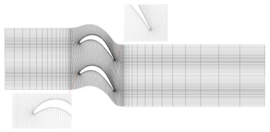 The computational grid is generated by commercial software AutoGrid 5. A structured O4H-type grid topology is selected in each blade passage. As shown in Figure 2, the blade surface is surrounded by the O-grid, and the rest is divided into the H-grid. The mesh in the tip region is locally refined.