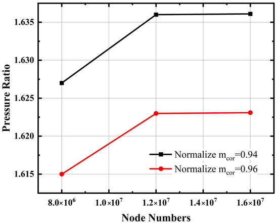 The meshes with the different numbers of nodes are calculated to determine mesh independence. The overall performances among the simulations with different nodes are compared in Figure 3. The normalize mcor in the legend stands for the ratio of corrected mass flow at operating point to the corrected mass flow at choke point. The red line (normalize mcor = 0.96) is the result near the peak efficiency point, and the black line (normalize mcor = 0.94) is that near the stall point. The total pressure ratio varies no more than 0.2% when the node number of the full circle exceeds . Based on the above analysis, the medium grid with nodes is sufficient for compressor performance calculations. The mesh distribution is 83 × 45 × 47 in the streamwise, blade-to-blade, and spanwise directions, respectively, for the rotor domain. The normal size of the first cell near the wall is set to 1 µm, which represents that the normalized wall distance (y+) is less than 1 in most regions, and the maximum value is less than 1.5.