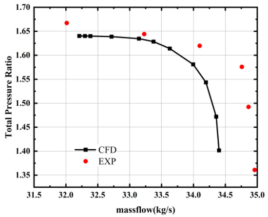 To validate the numerical methods, the numerical results are compared with the experiment data [22]. Figure 4 shows the comparisons of CFD and test results. For the total pressure ratio of the compressor stage, due to the deformation of the compressor geometry in the rotating state, the curve of CFD is lower than the experimental data. The maximum deviation in mass flow is 0.5 kg/s, appearing at the choke point. The total pressure ratio deviation reaches a maximum of 0.04 at the choke point. The mean absolute percentage error (MAPE) of mass flow is about 1.1%, and total pressure ratio MAPE is 2.7%. There are two possible reasons for the deviations: (1) rotating parts deform in the test condition, which changes the original blade profile and tip clearance; (2) the test takes the rakes to measure the characteristics, while the simulations use mass flow average parameters to calculate the characteristics. In general, the results of numerical simulations agree well with the trend of experimental measurement points, and the discrepancy presented in this study is similar to other studies [23]. Therefore, the method is acceptable for the following studies.