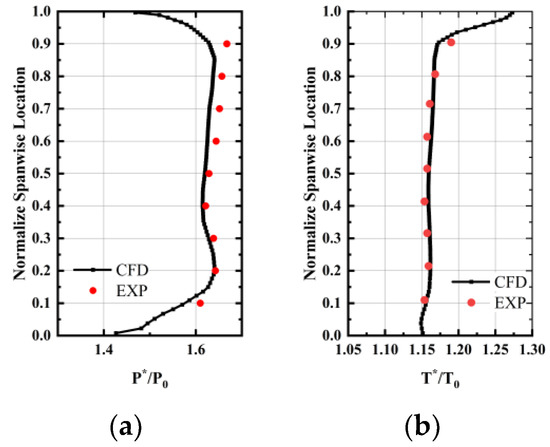 Comparison of the radial distribution downstream of the rotor alone at PE. (a) Total pressure radial profile; (b) total temperature radial profile.