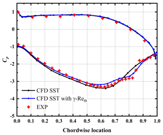 Furthermore, in order to verify the applicability of the transition model at low Reynolds numbers, a highly loaded turbine cascade Pak B is employed for validation [24,25,26]. Figure 6 presents the mesh topology of the cascade at mid-span, and the maximum normalized wall distance (y+) is less than 1. Figure 7 shows that the results predicted by the SST turbulence model with the transition model are in good agreement with the experimental data at . Compared with the SST model, the SST model with the transition model predicts the transition process of the blade suction surface, thus obtaining an accurate pressure coefficient distribution on the blade surface at low Reynolds numbers. The maximum deviation in near the transition point is 0.3, and the MAPE is 3%. Therefore, it shows that the present CFD model is proven to be accurate enough to acquire performances in the axial compressor at low Reynolds numbers, and it is used in the following simulations under the coupling condition.