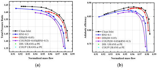 In Table 2, the performance losses are listed in different cases near the PE point. Compared with the uniform inlet airflow, the total pressure ratio and adiabatic efficiency are reduced with distorted inflow. The total pressure ratio decreases by 1.94% and the efficiency drops 0.45% in absolute value. Under the low Reynolds number condition, the performance of the compressor also decreases to a certain extent, the total pressure ratio reduces by 0.18% with little effect, and the efficiency drops by 1.19% in absolute value. For the coupling case, the losses in total pressure ratio and efficiency are 1.95% and 1.83%, respectively, not a linear stack related to losses under the single-factor conditions.