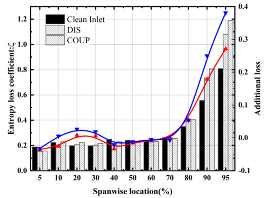 where is the entropy change under distortion or coupling conditions, and is the entropy change under the clean inlet condition. In the whole spanwise range, the additional loss under the coupling condition is no less than the additional loss under distortion. At 10% spanwise, the discrepancy between additional loss under coupling and distortion conditions is 0.019, with the largest difference of 0.11 in the tip region. It indicates that the coupling effects of the Reynolds number and inlet distortion on performance losses is mainly found in the low spanwise region near the hub and the tip region.