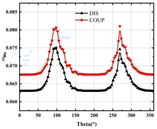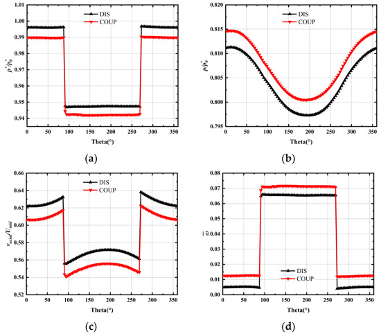 where represents the total pressure drop from the inlet of the computational domain to the AIP section. The denominator is the dynamic pressure at the inlet. In the circumferential location from 90° to 270°, the loss coefficient under the coupling condition is 0.0061 larger on average than that under the distortion condition. In the rest of the circumferential range, the loss coefficient under the coupling condition is higher than that under the distortion condition, about 0.0075. This indicates that the increase in upstream total pressure loss in the clean sector is slightly higher than that in the distortion sector with the coupling inflow.