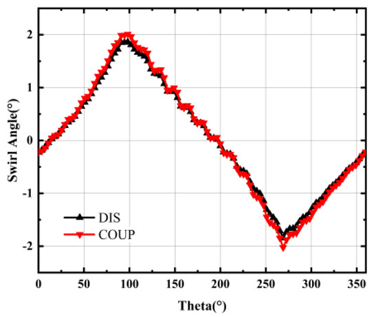 Figure 11 shows the time-averaged circumferential distribution of swirl angle in the AIP section at the 95% spanwise location. According to the distribution pattern, there is a positive swirl in the circumferential location from 0 to 180 deg and a negative swirl in the circumferential location from 180° to 360°. The circumferential distribution of the swirl angle under the distortion and coupling conditions follows the same pattern and has similar values, with the largest discrepancy occurring at the junction of the distortion and clean regions. At 90° and 270° circumferential positions, the maximum value of the difference between the two conditions of swirl angle is about 0.15°. It demonstrates that the coupling inflow has less of an effect on the distribution of the airflow angle into the blade row, which means that the circumferential distribution of blade loading is the same in the two cases.