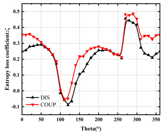 where presents the blade angle of attack, and represents the minimum value of the angle of attack, which is the angle of attack at the PE point with clean inflow. The circumferential distribution of the shock loss in the tip region under these two conditions is shown in Figure 18. In the full circumferential range, the shock wave loss in the tip region in the coupling case is larger than the shock wave loss with distortion. Moreover, the shock wave loss reaches a maximum at the position of 90° and 270°, i.e., the junction of the distortion and clean regions.