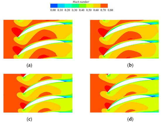 Comparison of Mach number contours at 10% spanwise location. (a) Clean sector at DIS; (b) clean sector at COUP; (c) distortion sector at DIS; (d) distortion sector at COUP.