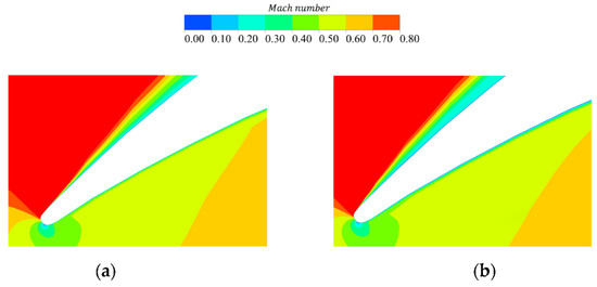 Comparison of Mach number contours in distortion region at 95% spanwise location. (a) DIS case; (b) COUP case.