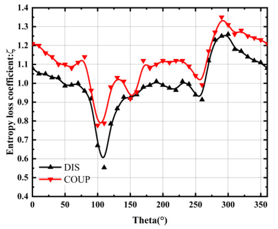 The star-shaped marker points in Figure 8 are the results of the unsteady calculations for the distortion and coupling cases, and the following analyses for losses and stability are mainly carried out on these two operating points. The definition of entropy loss coefficient is: