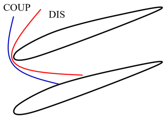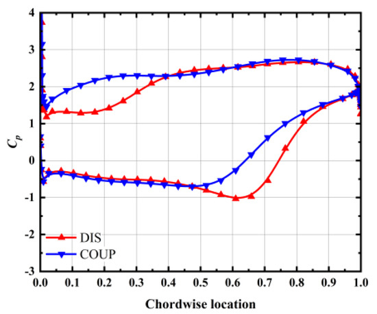 where is the boundary layer momentum thickness, is the chord length of the rotor blade, presents the boundary layer form factor, and and represent the air angle at the inlet and outlet of the blade row measured from the axial direction, respectively. The profile loss under the coupling condition is 0.037, and the profile loss within the distorted inflow is 0.033.