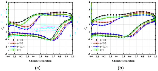 Comparison of the pressure distribution on the suction surface of the rotor blade. (a) DIS case; (b) COUP case.