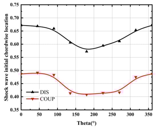 To manifest the starting position of the shock wave, the slope of and the chordwise location is calculated and the zero slope point is selected. Figure 23 provides the circumferential distribution of the shock wave initial chordwise location under different conditions. At different moments within one revolution, the variation in the shock wave structure under the coupling condition leads to a shift in the shock wave location upstream. The forward shift amount of the shock wave onset position under coupling conditions at different circumferential positions is almost the same, with the shock wave moving upstream by an average of 0.18 chord lengths.