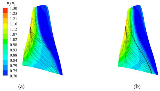Based on the above analyses, the increase in the boundary layer thickness under the coupling condition changes the blade geometry felt by the incoming airflow and affects the structure of the shock wave system in the blade passage, which changes the pressure distribution on the rotor blade surface. At the T/4 moment, the rotor blade is in the transition from the clean to the distortion region, which is the critical region for inducing instability phenomena. The surface pressure distribution on the suction side of the rotor blade under different inflow conditions is shown in Figure 24. Under distortion conditions, the intensity of the shock wave is large, and the flow of the blade suction surface is affected by the shock wave. There is a local high-pressure area after the shock wave in the tip region, and it increases the blade surface radial adverse pressure gradient. Therefore, fluid from the rotor blade hub region migrates radially and streamwise, exiting the blade channel in the mid-spanwise region (shown in Figure 24a). Under coupling conditions, the intensity of the shock wave decreases due to the increase in the thickness of the boundary layer, which weakens the high-pressure area at the trailing edge of the blade to some extent. The adverse pressure gradient along the blade surface in the radial direction is weakened, and the change in the pressure distribution on the suction surface of the rotor blades reduces the pressure gradient in the radial direction, allowing the fluid transported from the blade hub to the tip region (shown in Figure 24b).