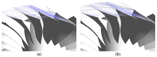 Figure 25 shows the radial velocity distribution under distortion and coupling conditions. Compared to the distorted inflow, the radial velocity of the blade rear section increases significantly under the coupling condition. At the trailing edge of the blade, the radial velocity of the blade surface flow increases from 65 m/s (Figure 24a) to 93 m/s (Figure 24a).