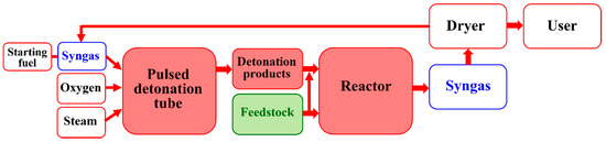 These gaseous detonation products are further used as a gasifying agent for atmospheric-pressure gasification of biomass in a flow reactor. Full gasification of biomass with the formation of syngas CO + H2 with H2/CO = 1 is assumed to occur in the flow reactor. A part of generated syngas is compressed and directed back to the pulsed detonation tube, whereas the rest of generated syngas goes to an external syngas user. The task is to determine a part of syngas used for ones’ own needs and a part directed to the external user with due regard for energy requirements for oxygen and steam production, and syngas compression before entering the pulsed detonation tube.