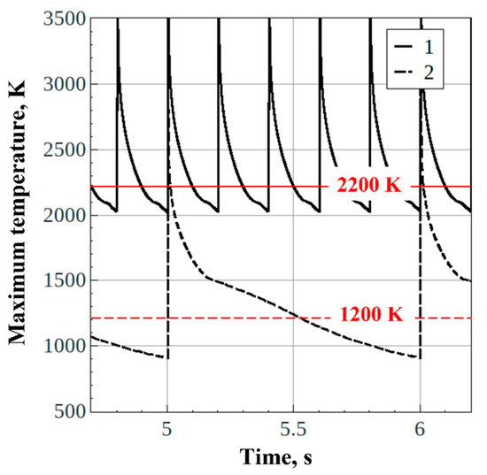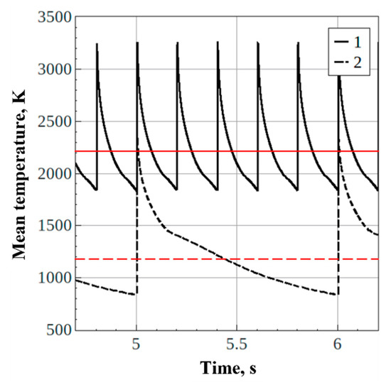 Calculated time histories of the maximum mean temperature in the flow reactor at pulsed detonation gun operation with frequencies of = 1 and 5 Hz without feed of waste ( = 450 K, = 0.1 MPa). Horizontal lines correspond to the time-averaged mean temperature values in the flow reactor.