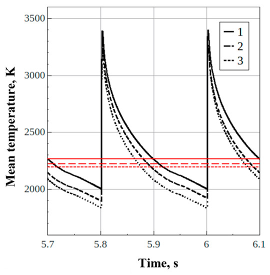Calculated time histories of mean temperature in the flow reactor at pulsed detonation gun operation with a frequency of = 5 Hz without waste feed ( = 0.1 MPa): = 800 K (1), 650 K (2) и 450 K (3).