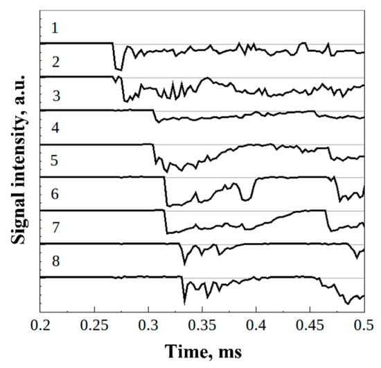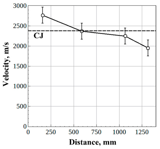 At an operation frequency of f = 1 Hz, the mass flow rate of the explosive mixture (and detonation products) through the pulsed detonation gun is ~10 g/s. During the fill process, the supply pressure of oxygen and natural gas, as well as their mass flow rates, are controlled. Based on the ratio of mass flow rates, the overall fuel-to-oxygen equivalence ratio Φ in the mixture is determined. The error in determining Φ is estimated at 5%. Upon completion of the fill process, the mixture is ignited. Mixture ignition is followed by flame acceleration and DDT, formation of a detonation wave and its bifurcation in the Y-section of the pulsed detonation gun. Detonation wave propagation in the pulsed detonation gun is controlled by eight ionization probes installed along the gun (Figure 5): two probes (1 and 2) at the end of the flame acceleration section, and three probes in each branch tube (3, 5, 7 and 4, 6, 8, respectively). It can be seen from Figure 5 that in both branch tubes, detonation waves propagate synchronously. Knowing the distance between the ionization probes and the time interval between the arrival of the detonation wave front on neighboring probes, one can determine the detonation velocity. Figure 6 shows the change in the detonation velocity along the length of the pulsed detonation gun. The vertical bars correspond to the cycle-to-cycle variability in the detonation velocity (±200 m/s). The horizontal dashed line corresponds to the Chapman–Jouguet (CJ) thermodynamic detonation velocity (~2400 m/s) at Φ = 1.0. The excess in the measured detonation velocity over this value in the initial section of the gun is caused by detonation overdrive during DDT. The decrease in the measured detonation velocity at the end of the gun is caused by the incomplete fill of the branch tubes with the explosive mixture and by diluting the explosive mixture with purge steam. In the gun segment from 500 to 1100 mm, the detonation velocity is seen to vary within the range of 2100–2600 m/s. The time taken for filling the volume of pulsed detonation gun of Figure 2 with a combustible mixture is estimated at ~0.4 s. The measured time taken for the DDT and detonation wave propagation along the pulsed detonation gun is about 2 ms, and the characteristic residence time of the major mass of detonation products in the gun is also few milliseconds. Thus, a major part of the operation cycle time is occupied by the fill process. After the detonation products release to the flow reactor, the supply valves of oxygen, natural gas, and steam are kept closed for some time (for about 0.6 s); thereafter, a new cycle starts.
