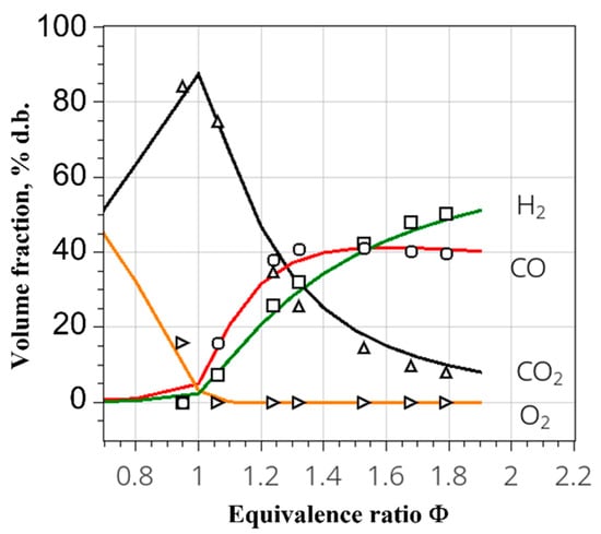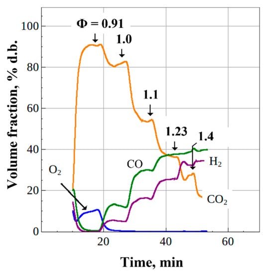 It is worth noting that no condensed-phase by-products such as tar and char were detected in the gasification experiments under discussion. Additionally, there were no mineral residues. On the one hand, it is explained by the feedstocks used (natural gas, waste machine oil, and wood sawdust) containing nearly no ash. On the other hand, it is explained by high gasification temperature (well above 1200 K) and relatively long residence time (up to 15 s [20]) of feedstocks in the gasifier.