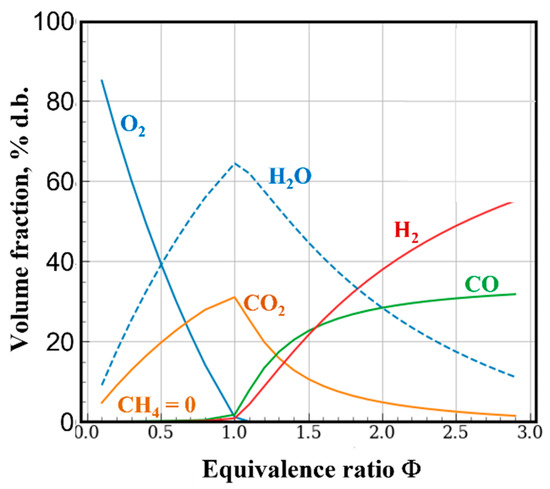 It is interesting to compare the measured volume fractions of H2, CO, CO2, and O2 with the “frozen” composition of detonation products of methane–oxygen mixtures rapidly expanded to P = 0.1 MPa in a flow reactor. For this purpose, thermodynamic calculations (P-T problem) were performed at temperatures of composition freezing ranging from 1400 to 2600 K, since this freezing temperature was unknown in advance. It turned out that the measured and calculated compositions of expanded dry detonation products agreed best with each other at a freezing temperature of 2200 K. Figure 9 compares the measured and calculated compositions at a temperature of 2200 K and a pressure of P = 0.1 MPa. In addition, Figure 10 shows the calculated composition of detonation products including steam as a function of Φ. The calculated volume fractions of H2O and CO2 at Φ = 1 are 65 and 30%, and at Φ → 2 they decrease to ~30 and ~5%, respectively. As the mean temperature in the flow reactor is considerably less than 2200 K (only ~1200 K, see Figure 3), the results of Figure 9 and Figure 10 indicate that natural gas conversion proceeds in the detonation waves while they propagate along the pulsed detonation gun, rather than in the flow reactor itself. It also follows from Figure 9 and Figure 10 that, in contrast to modern low-temperature technologies of steam and steam–carbon dioxide conversion of natural gas, the pulsed detonation gun technology provides complete (100%) natural gas conversion, and at Φ → 2, dry syngas mainly contains H2 and CO with the H2/CO ratio of approximately 1.4.