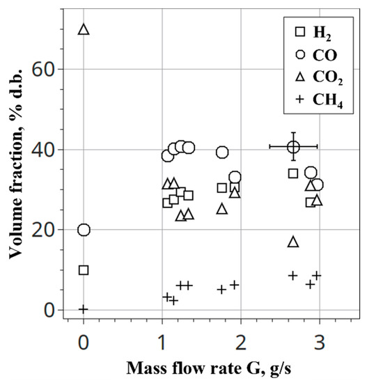 Measured composition of cooled dry products of liquid waste gasification versus the mass flow rate of waste ( = 1 Hz, 0.1 MPa). Measurement errors are shown only for the near-limiting value of G.