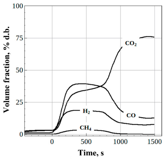Contrary to experiments with liquid waste, experiments with solid waste were performed using a batch feed scheme. A batch of waste was loaded in the flow reactor and gasified over some period of time. In this case, both the temperature of the gases in the flow reactor and the composition of the product syngas reached steady-state levels starting from a certain point in time. After a certain period of gasifier operation, the composition of the product syngas began to change again, which indicated the completion of the gasification process due to the lack of feedstock. As an example, Figure 12 shows primary records of changes in the composition of cooled dry syngas during the experiment. Time point “0” in Figure 12 corresponds to the beginning of the release of the product syngas to gas analyzer. The volume fractions of H2, CO, CO2 and CH4 increased to steady-state values of 20, 40, 35, and 5%vol d.b., respectively. The maximum run-to-run scatter in the measured values of volume fractions of H2 and CO is ±5%. The H2/CO and CO/CO2 ratios in the product syngas were approximately 0.5 and 1.15. The total volume fraction of combustible gases in the product syngas (H2, CO, and CH4) increased to 65%vol d.b. Obviously, these changes were caused by the gasification reactions. Note that the composition of the product syngas was well reproduced from experiment to experiment.