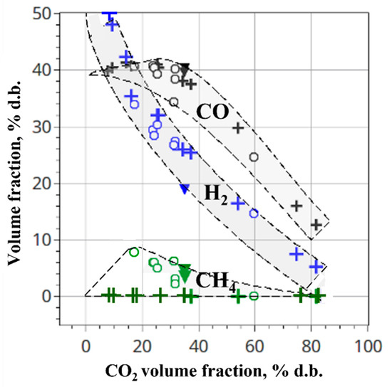 Very similar compositions of syngas were reported by other researchers using high-temperature techniques for organic waste gasification. Thus, the plasma torch with hybrid water/gas stabilization of arc was used in [9,10] for steam/CO2 gasification of pyrolysis oil, wood sawdust, and refuse-derived fuel at a mean process temperature of 1150–1350 K and pressure of 0.1 MPa, which is very close to the process mean temperature and pressure in the current experiments (~1200 K and 0.1 MPa). For pyrolysis oil, the volume fractions of H2, CO, and CH4 in the product syngas were 58, 33, and 4.9%, respectively, at CO2 volume fraction of 4% [10]. For wood sawdust, the volume fractions of H2, CO, and CH4 in the product syngas were 42–43, 44–49, and 1.3–1.7%, respectively, at CO2 volume fraction of 4.7–7.2% [9]. For refuse-derived fuel, containing 47%wt plastics, 24%wt wood and paper, 10%wt textiles, and 18%wt fines, the volume fractions of H2, CO and CH4 in the product syngas were 41–50, 44–41, and 5–3%, respectively, at CO2 volume fraction of 9.4–6.5% [10]. These results fit well the data of Figure 13.