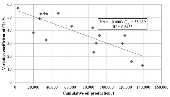 Raupov (2016) [101] established the dependences of light absorption factor from development process indicators: change in oil production rate and change in water cut (Figure 4). To increase oil production, the minimum Cla change is characteristic (Figure 4a). A similar pattern of Cla change is observed when the variation of watercut in Figure 4b increases.