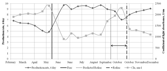 Equations of dependence, based on the analysis of technological indicators of the development process (dynamic variation of oil production rate, watercut) and coefficient of light absorbance, are also used as evaluation of well-intervention efficiency. For example, to justify a refract application, the time-dependent trend of the coefficient of light absorbance was determined [22,98]. After hydraulic fracturing, previously undrained oil-saturated part of the formation is connected, resulting in a decrease and further stabilization of the coefficient of light absorbance. After some period of time (efficiency duration of hydraulic fracturing), the coefficient of light absorbance increases, which indicates that the previously connected section is depleted and refrac is needed once again (Figure 2). Due to the prediction of the optimal period for refrac, an additional 78 tons (for one month) were produced [98].
